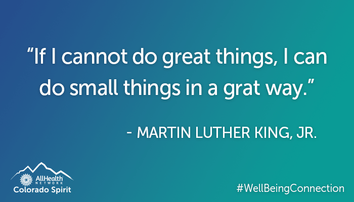 - Express Gratitude – Practicing gratitude has several health and well-being benefits. Gratitude can also be contagious – the more we spread, the more we receive. Gratitude can also be a good way to reframe difficult experiences and help face future hardships. Watch Colorado Spirit’s Tuesday Talk for a deeper dive into gratitude.